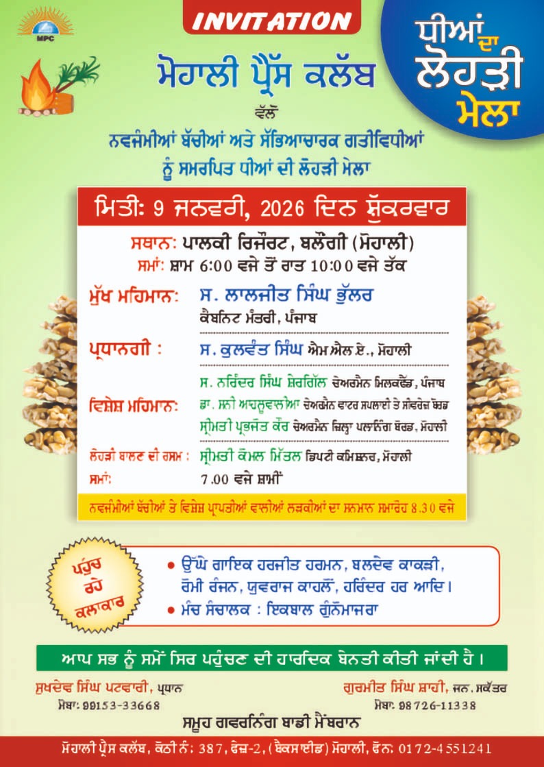 Mohali, 9 January, Punjabi Dunia Bureau: Mohali Press Club will organise Dhian Di Lohri Mela on January 9, 2026, with great enthusiasm to celebrate Lohri while promoting the social message of respect and pride for daughters. The event will be held under the banner of cultural harmony and social awareness. Sharing details, Mohali Press Club…