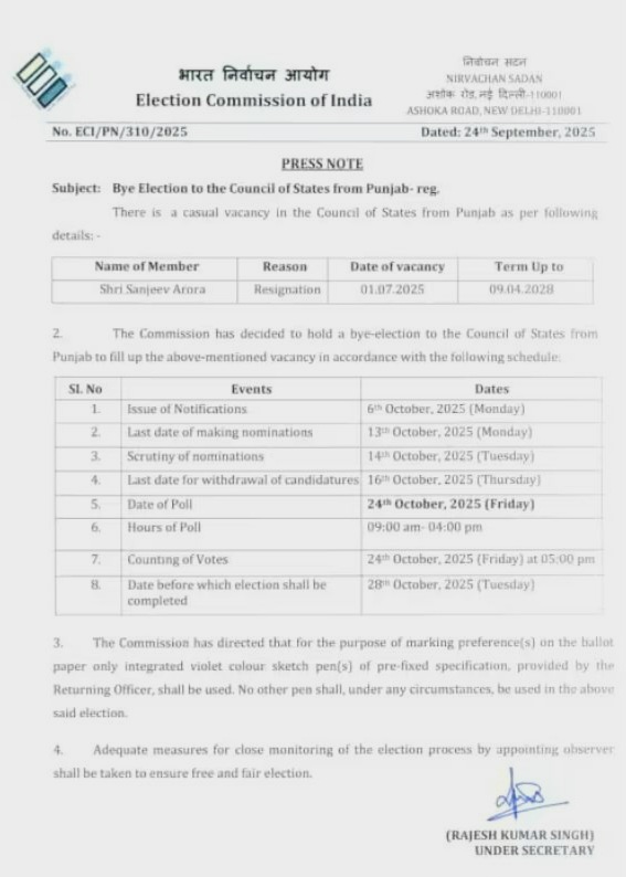 ਮੁੱਖ ਚੋਣ ਕਮਿਸ਼ਨਰ ਵੱਲੋਂ ਪੰਜਾਬ ਦੀ ਰਾਜ ਸਭਾ ਸੀਟ ਲਈ ਚੋਣ ਦਾ ਐਲਾਨ ਕਰ ਦਿੱਤਾ ਗਿਆ ਹੈ। ਰਾਜ ਸਭਾ ਦੀ ਸੀਟ ਲਈ ਜ਼ਿਮਨੀ ਚੋਣ 24 ਅਕਤੂਬਰ ਨੂੰ ਹੋਵੇਗੀ ਜਦਕਿ 13 ਅਕਤੂਬਰ ਤੱਕ ਨਾਮਜ਼ਦਗੀਆਂ ਦਾਖਲ ਕਰ ਸਕਣਗੇ।