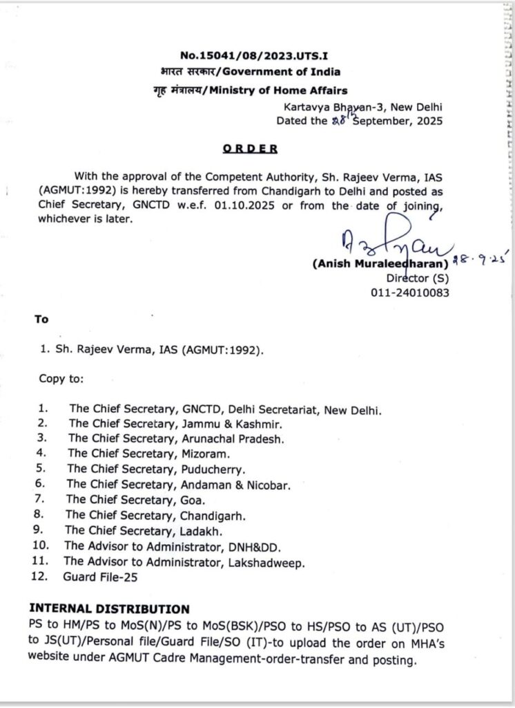 ਕੇਂਦਰ ਦੀ ਭਾਜਪਾ ਸਰਕਾਰ ਨੇ ਚੰਡੀਗੜ੍ਹ ਦੇ ਮੁੱਖ ਸਕੱਤਰ ਦੀ ਬਦਲੀ ਕਰਕੇ ਦਿੱਲੀ ਭੇਜ ਦਿੱਤਾ ਹੈ। ਚੰਡੀਗੜ੍ਹ ਦੇ ਮੁੱਖ ਸਕੱਤਰ ਰਾਜੀਵ ਵਰਮਾ ਦੀ ਚੰਡੀਗੜ੍ਹ ਤੋਂ ਦਿੱਲੀ ਬਦਲੀ ਕੀਤੀ ਗਈ ਹੈ, ਉਹ 1 ਅਕਤੂਬਰ 2025 ਨੂੰ ਉਥੇ ਜੁਆਇੰਨ ਕਰਨਗੇ।