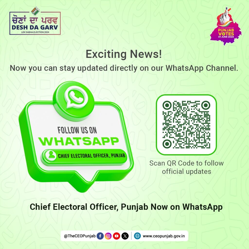 ਇੱਕ ਨਿਵੇਕਲੇ ਉਪਰਾਲੇ ਤਹਿਤ ਪੰਜਾਬ ਦੇ ਮੁੱਖ ਚੋਣ ਅਧਿਕਾਰੀ ਦਫ਼ਤਰ ਨੇ ਇੱਕ ਸਮਰਪਿਤ ਵਟਸਐਪ ਚੈਨਲ, ‘ਮੁੱਖ ਚੋਣ ਅਧਿਕਾਰੀ, ਪੰਜਾਬ’ ਦੀ ਸ਼ੁਰੂਆਤ ਕੀਤੀ ਹੈ।