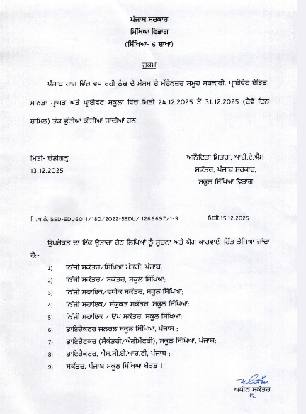 ਪੰਜਾਬ ਸਰਕਾਰ ਨੇ ਸਕੂਲਾਂ ‘ਚ ਸਰਦੀਆਂ ਦੀਆਂ ਛੁੱਟੀਆਂ ਦਾ ਐਲਾਨ ਕਰ ਦਿੱਤਾ ਹੈ। ਪੰਜਾਬ ਸਰਕਾਰ ਦੇ ਸਕੂਲ ਸਿੱਖਿਆ ਵਿਭਾਗ ਦੀ ਸਕੱਤਰ ਅਨਿੰਦਿਤਾ ਮਿੱਤਰਾ ਅਨੁਸਾਰ, ਇਹ ਹੁਕਮ ਸਾਰੇ ਸਰਕਾਰੀ ਸਕੂਲਾਂ ਦੇ ਨਾਲ-ਨਾਲ ਪ੍ਰਾਈਵੇਟ ਸਹਾਇਤਾ ਪ੍ਰਾਪਤ, ਮਾਨਤਾ ਪ੍ਰਾਪਤ ਅਤੇ ਪ੍ਰਾਈਵੇਟ ਸਕੂਲਾਂ ‘ਤੇ ਲਾਗੂ ਹੁੰਦਾ ਹੈ, ਜਿਸ ਤਹਿਤ ਸੂਬੇ ਵਿੱਚ ਸਾਰੇ ਸਕੂਲ 24 ਦਸੰਬਰ ਤੋਂ 31 ਦਸੰਬਰ ਤੱਕ ਬੰਦ ਰਹਿਣਗੇ। ਸਕੂਲ 1 ਜਨਵਰੀ ਨੂੰ ਦੁਬਾਰਾ ਖੁੱਲ੍ਹਣਗੇ।