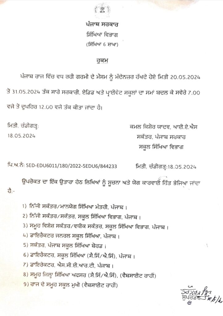 ਪੰਜਾਬ ਵਿੱਚ ਵਧ ਰਹੀ ਗਰਮੀ ਦੇ ਮੌਸਮ ਨੂੰ ਮੱਦੇਨਜ਼ਰ ਰੱਖਦੇ ਹੋਏ ਸਕੂਲਾਂ ਦਾ ਸਮਾਂ ਬਦਲਿਆ ਗਿਆ ਹੈ। ਹੁਣ ਸੋਮਵਾਰ ਮਿਤੀ 20.05.2024 ਤੋਂ 31.05.2024 ਤੱਕ ਸਾਰੇ ਸਰਕਾਰੀ, ਏਡਿਡ ਅਤੇ ਪ੍ਰਾਈਵੇਟ ਸਕੂਲਾਂ ਦਾ ਸਮਾਂ ਬਦਲ ਕੇ ਸਵੇਰੇ 7.00 ਵਜੇ ਤੋਂ ਦੁਪਹਿਰ 12.00 ਵਜੇ ਤੱਕ ਕੀਤਾ ਜਾਂਦਾ ਹੈ।