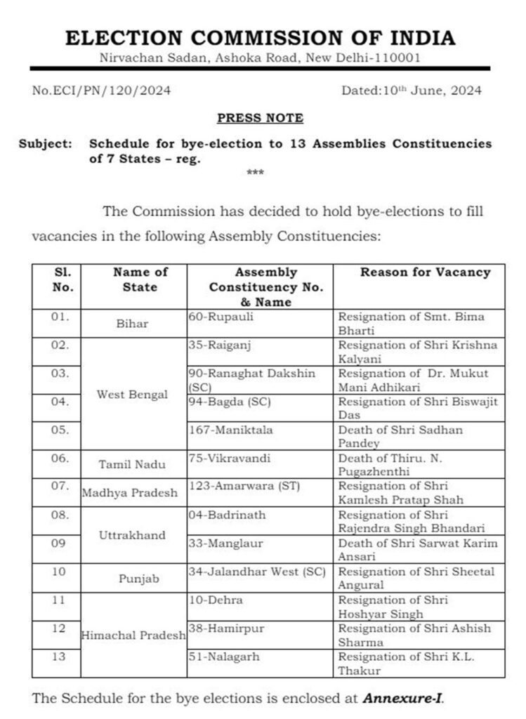 ਜਲੰਧਰ ਸਮੇਤ ਦੇਸ਼ ਦੀਆਂ 13 ਵਿਧਾਨ ਸਭਾ ਸੀਟਾਂ ਲਈ ਜ਼ਿਮਨੀ ਚੋਣਾਂ 10 ਜੁਲਾਈ ਨੂੰ
