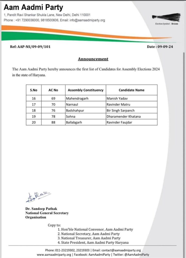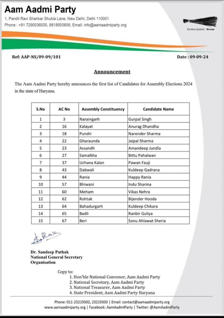 ਆਮ ਆਦਮੀ ਪਾਰਟੀ ਨੇ ਹਰਿਆਣਾ ਵਿਧਾਨ ਸਭਾ ਚੋਣਾਂ ਲਈ 20 ਉਮੀਦਵਾਰਾਂ ਦੀ ਪਹਿਲੀ ਸੂਚੀ ਜਾਰੀ ਕੀਤੀ ਹੈ। ਹਰਿਅਣਾ ਦੇ ਪਾਰਟੀ ਪ੍ਰਧਾਨ ਸੁਸ਼ੀਲ ਕੁਮਾਰ ਵੱਲੋਂ ਦੂਜੀ ਲਿਸਟ ਸ਼ਾਮ ਤੱਕ ਆਉਣ ਦੀ ਗੱਲ ਕੀਤੀ ਗਈ ਹੈ।