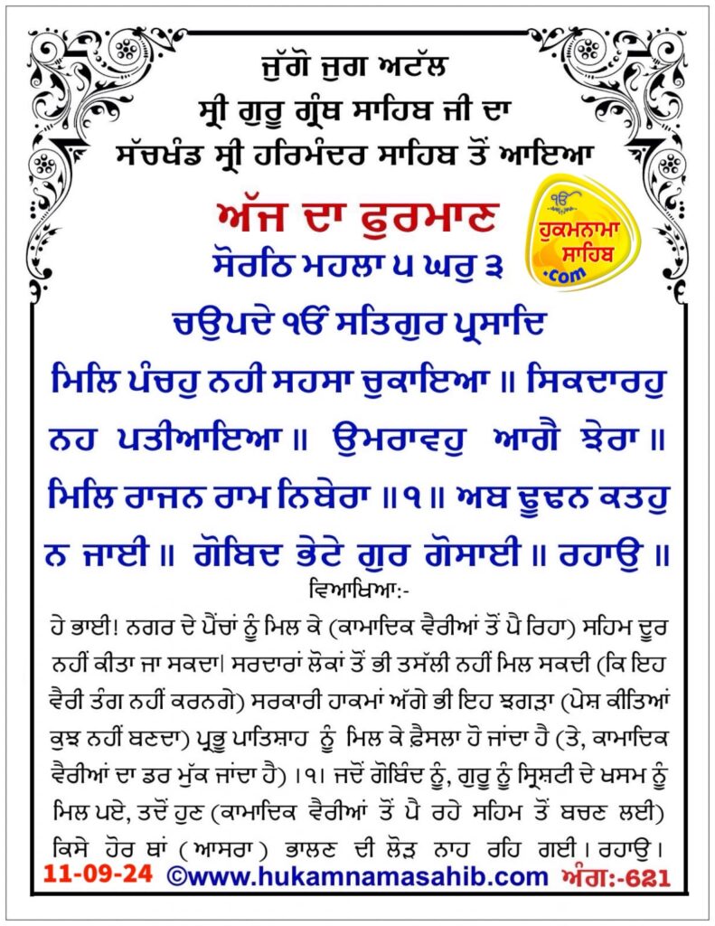 Sachkhand Sri Harmandir Sahib Amritsar Vekhe Hoea Amrit Wela Da Mukhwak: 11-09-24 Ang 621