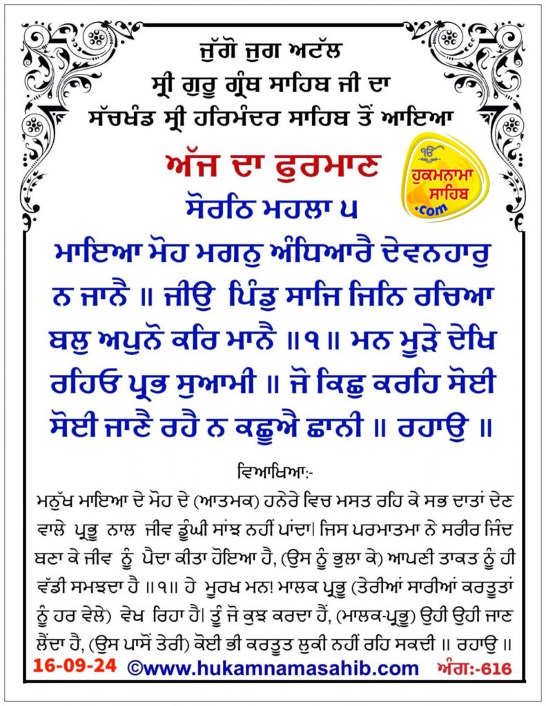ਅੰਮ੍ਰਿਤ ਵੇਲੇ ਦਾ ਹੁਕਮਨਾਮਾ ਸ੍ਰੀ ਦਰਬਾਰ ਸਾਹਿਬ, ਅੰਮ੍ਰਿਤਸਰ, ਮਿਤੀ 16-09-2024 ਅੰਗ 616
