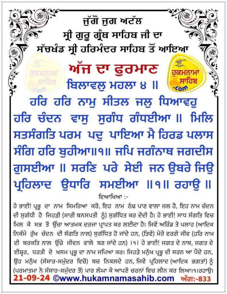 Amrit vele da Hukamnama Sri Darbar Sahib, Amritsar, Ang 833, 21-09-2024