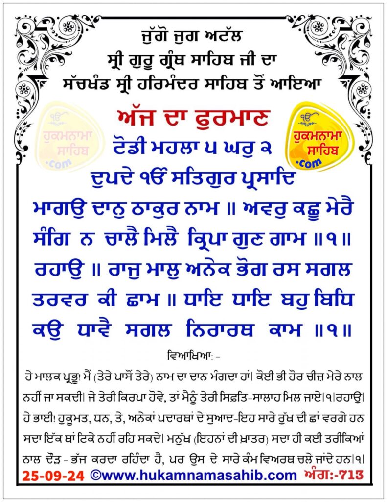 ਅੰਮ੍ਰਿਤ ਵੇਲੇ ਦਾ ਹੁਕਮਨਾਮਾ ਸ੍ਰੀ ਦਰਬਾਰ ਸਾਹਿਬ, ਅੰਮ੍ਰਿਤਸਰ, ਮਿਤੀ 09-25-2024 ਅੰਗ 713