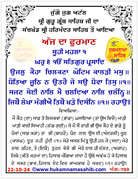 ਅੰਮ੍ਰਿਤ ਵੇਲੇ ਦਾ ਹੁਕਮਨਾਮਾ ਸ੍ਰੀ ਦਰਬਾਰ ਸਾਹਿਬ, ਅੰਮ੍ਰਿਤਸਰ, ਮਿਤੀ 22-10-2024 ਅੰਗ 729