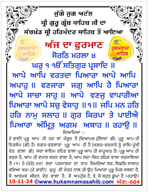 AMRIT VELE DA HUKAMNAMA SRI DARBAR SAHIB AMRITSAR, ANG 604, 10-11-24