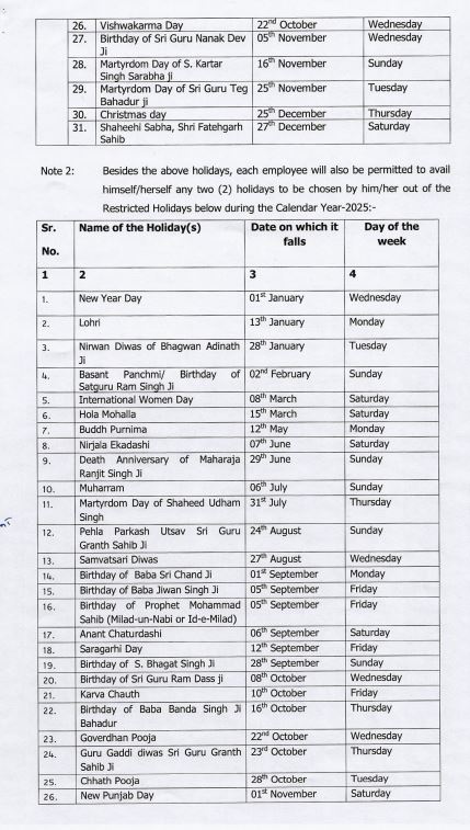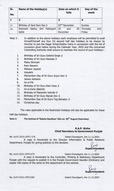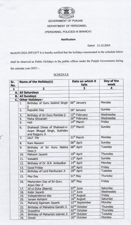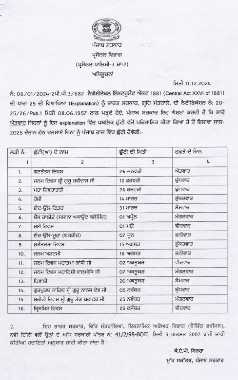 ਪੰਜਾਬ ਸਰਕਾਰ ਵੱਲੋਂ ਸਾਲ 2025 ਦੀਆਂ ਛੁੱਟੀਆਂ ਦੀ ਸੂਚੀ ਜਾਰੀ ਕੀਤੀ ਗਈ ਹੈ।