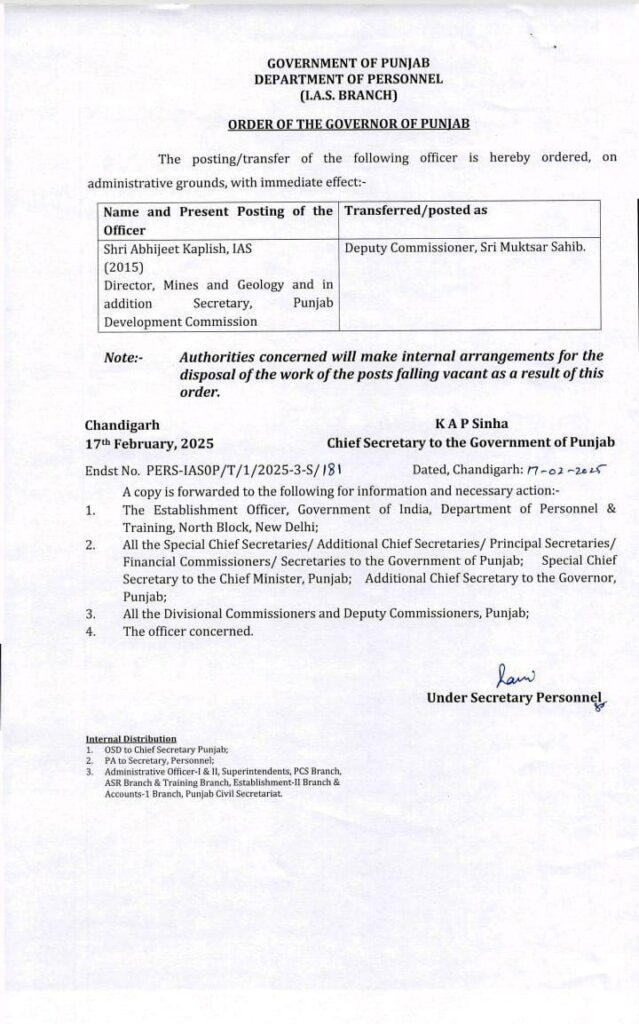 ਇਸ ਲਈ ਪੰਜਾਬ ਸਰਕਾਰ ਵੱਲੋਂ ਆਈਏਐਸ ਅਧਿਕਾਰੀ ਅਭਿਜੀਤ ਕਪਿਲਿਸ ਨੂੰ ਸ੍ਰੀ ਮੁਕਤਸਰ ਸਾਹਿਬ ਦਾ ਨਵਾਂ ਡੀਸੀ ਲਗਾਇਆ ਗਿਆ ਹੈ।