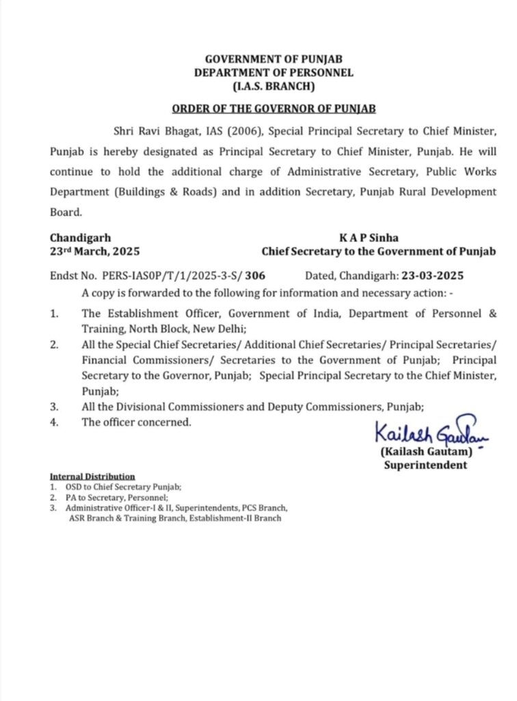 2006 ਬੈਚ ਦੇ ਆਈਏਐਸ ਅਧਿਕਾਰੀ ਰਵੀ ਭਗਤ ਨੂੰ ਮੁੱਖ ਮੰਤਰੀ ਦਾ ਪ੍ਰਿੰਸੀਪਲ ਸਕੱਤਰ ਲਗਾਇਆ ਗਿਆ ਹੈ।