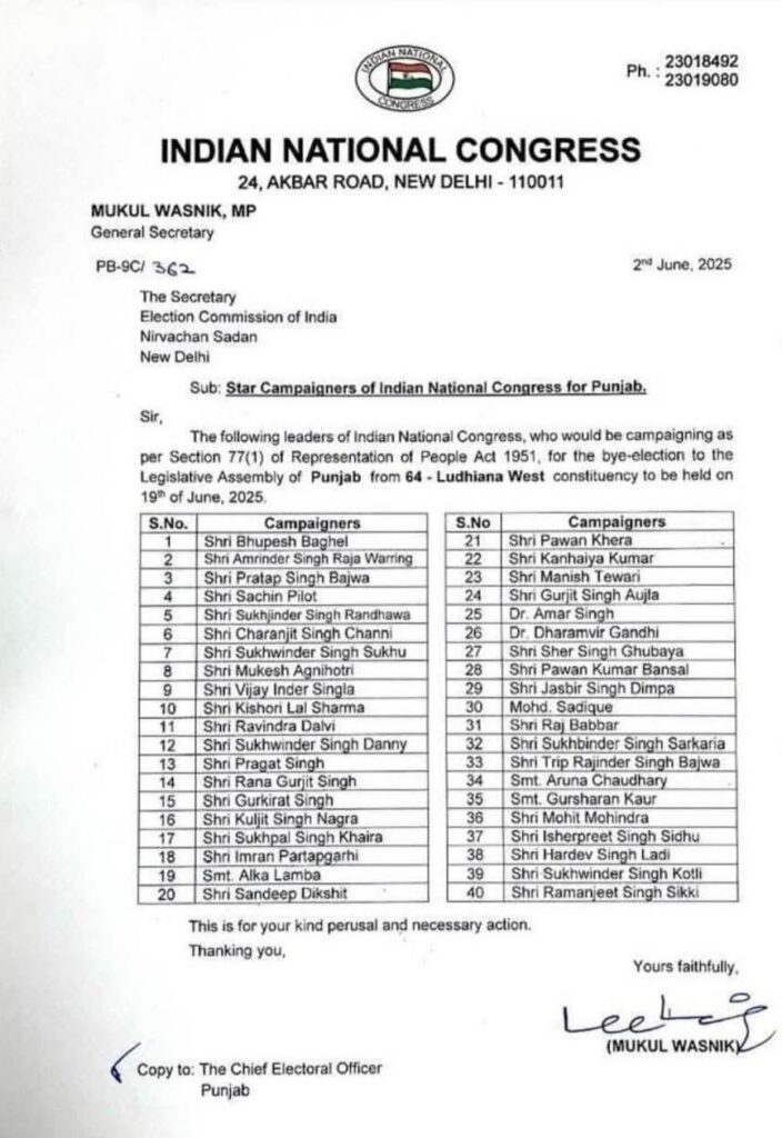 ਕਾਂਗਰਸ ਪਾਰਟੀ ਵੱਲੋਂ ਲੁਧਿਆਣਾ ਵਿੱਚ ਹੋਣ ਵਾਲੀ ਜ਼ਿਮਨੀ ਚੋਣ ਲਈ ਸਟਾਰ ਪ੍ਰਚਾਰਕਾਂ ਦੀ ਸੂਚੀ ਜਾਰੀ ਕੀਤੀ ਗਈ ਹੈ, ਜੋ ਇਸ ਤਰ੍ਹਾਂ ਹੈ:
