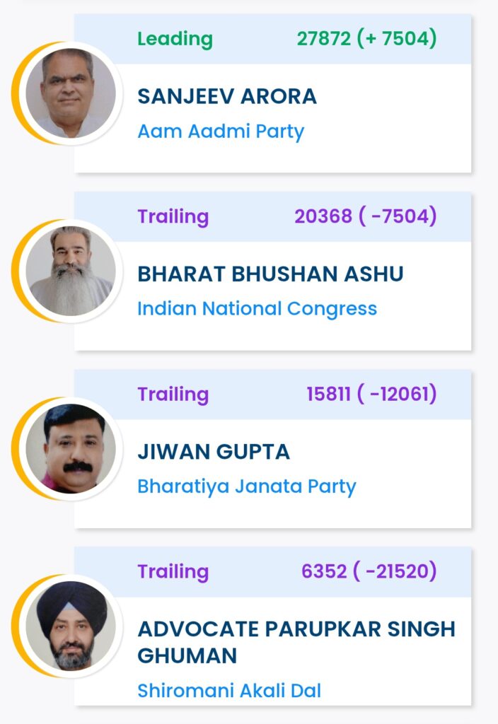 ਲੁਧਿਆਣਾ ਪੱਛਮੀ ਵਿਧਾਨ ਸਭਾ ਸੀਟ ‘ਤੇ ਵੋਟਾਂ ਦੀ ਗਿਣਤੀ ਜਾਰੀ ਹੈ ਅਤੇ ਹੁਣ ਤੱਕ 11 ਦੌਰ ਪੂਰੇ ਹੋ ਚੁੱਕੇ ਹਨ। ‘ਆਪ’ ਉਮੀਦਵਾਰ ਸੰਜੀਵ ਅਰੋੜਾ 7504 ਵੋਟਾਂ ਨਾਲ ਅੱਗੇ ਚੱਲ ਰਹੇ ਹਨ। ਕਾਂਗਰਸ ਦੂਜੇ ਸਥਾਨ ‘ਤੇ, ਭਾਜਪਾ ਤੀਜੇ ਸਥਾਨ ‘ਤੇ ਅਤੇ ਸ਼੍ਰੋਮਣੀ ਅਕਾਲੀ ਦਲ ਚੌਥੇ ਸਥਾਨ ‘ਤੇ ਹੈ।