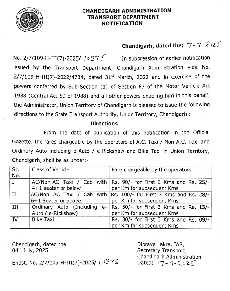 ਚੰਡੀਗੜ੍ਹ ‘ਚ ਟੈਕਸੀਆਂ-ਆਟੋਜ਼ ਦੇ ਨਵੇਂ ਕਿਰਾਏ ਤੈਅ, ਨੋਟੀਫਿਕੇਸ਼ਨ ਜਾਰੀ
