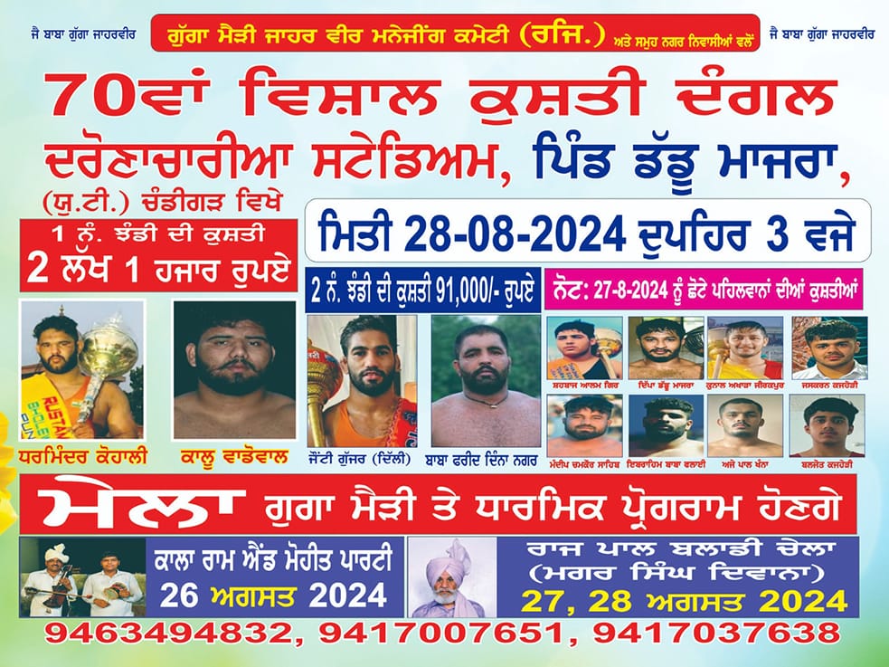 ਚੰਡੀਗੜ੍ਹ, 26 ਅਗਸਤ, ਪੰਜਾਬੀ ਦੁਨੀਆ ਬਿਊਰੋ : ਗੁੱਗਾ ਮੈੜੀ ਜ਼ਾਹਰ ਵੀਰ ਮੈਨੇਜਿੰਗ ਕਮੇਟੀ (ਰਜਿ:), ਪਿੰਡ ਡੱਡੂ ਮਾਜਰਾ, ਚੰਡੀਗੜ੍ਹ ਅਤੇ ਸਮੂਹ ਨਗਰ ਨਿਵਾਸੀਆਂ ਦੇ ਸਹਿਯੋਗ ਨਾਲ 70ਵਾਂ ਵਿਸ਼ਾਲ ਕੁਸ਼ਤੀ ਦੰਗਲ ਮਿਤੀ 28 ਅਗਸਤ 2022, ਦਿਨ ਬੁੱਧਵਾਰ ਨੂੰ ਬਾਅਦ ਦੁਪਹਿਰ 3.00 ਵਜੇ ਪਿੰਡ ਦੇ ਦਰੋਣਾਚਾਰੀਆ ਖੇਡ ਸਟੇਡੀਅਮ ਵਿਖੇ ਕਰਵਾਇਆ ਜਾ ਰਿਹਾ ਹੈ। ਇਸ ਦੌਰਾਨ ਕਮੇਟੀ ਮੈਂਬਰਾਂ ਵਲੋਂ…