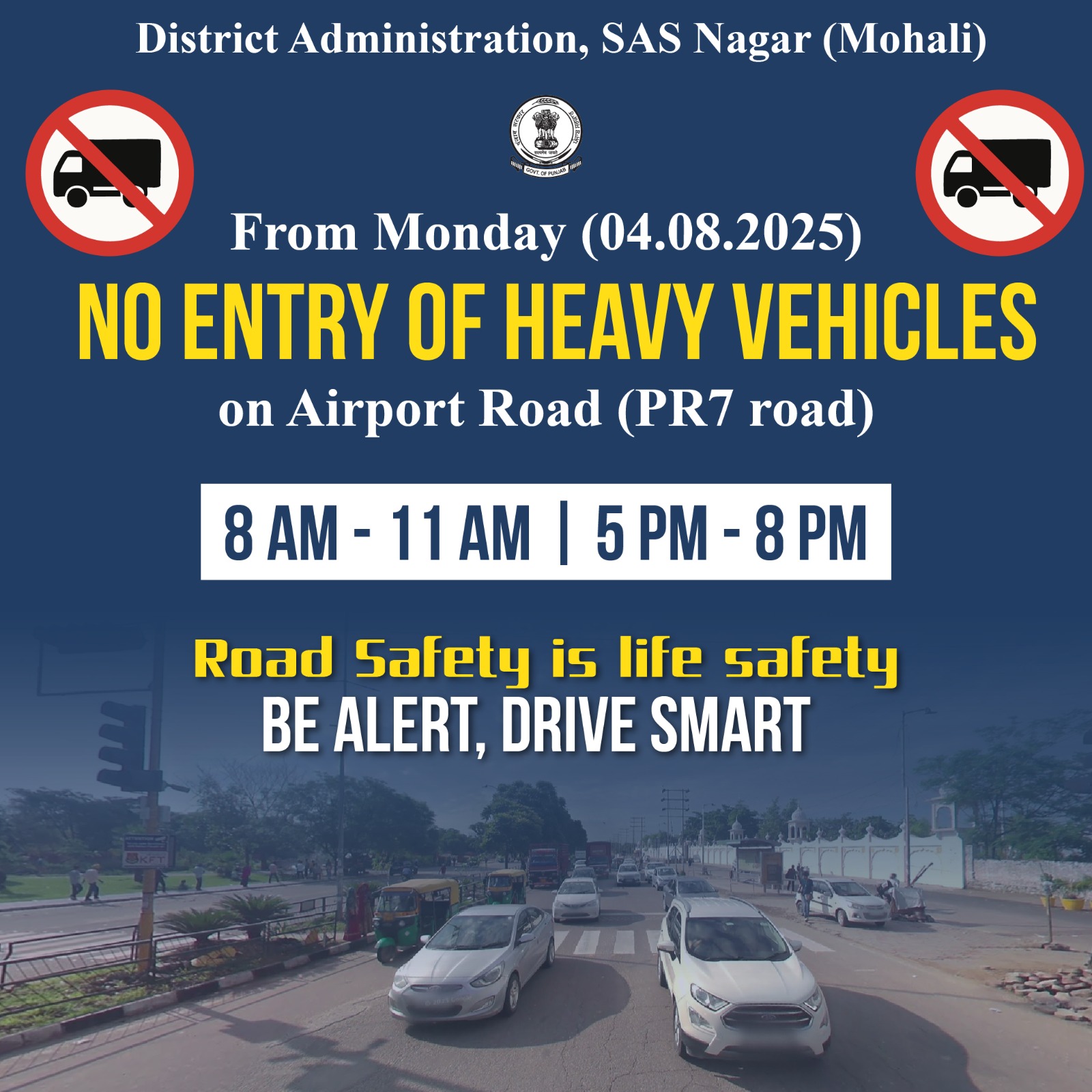 ਐਸ.ਏ.ਐਸ. ਨਗਰ, 2 ਅਗਸਤ, ਅਮਨਦੀਪ ਸਿੰਘ : ਸੁਚਾਰੂ ਆਵਾਜਾਈ ਨੂੰ ਯਕੀਨੀ ਬਣਾਉਣ, ਹਾਦਸਿਆਂ ਨੂੰ ਰੋਕਣ ਅਤੇ ਯਾਤਰੀਆਂ ਦੀ ਸੁਰੱਖਿਆ ਨੂੰ ਯਕੀਨੀ ਬਣਾਉਣ ਲਈ, ਜ਼ਿਲ੍ਹਾ ਪ੍ਰਸ਼ਾਸਨ ਮੋਹਾਲੀ (ਸਾਹਿਬਜ਼ਾਦਾ ਅਜੀਤ ਸਿੰਘ ਨਗਰ) ਨੇ ਸਵੇਰ ਦੇ ਭਾਰੀ ਆਵਾਜਾਈ ਦੇ ਚੋਣਵੇਂ ਸਮੇਂ ਦੌਰਾਨ ਏਅਰਪੋਰਟ ਰੋਡ (ਪੀ ਆਰ-7) ‘ਤੇ ਸੈਕਟਰ-66/82 ਜੰਕਸ਼ਨ ਤੋਂ ਏਅਰਪੋਰਟ ਗੋਲ ਚੱਕਰ ਤੱਕ ਭਾਰੀ ਵਾਹਨਾਂ ਦੀ ਆਵਾਜਾਈ…