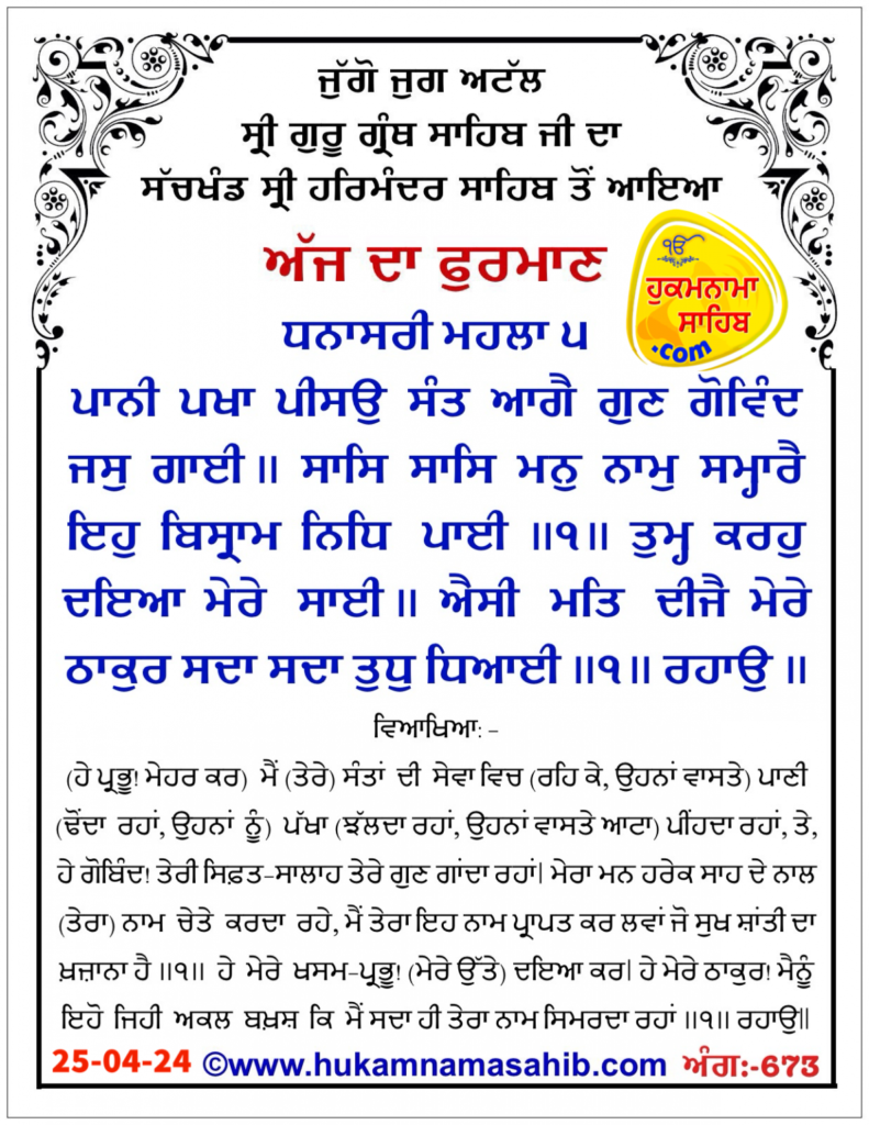 Amrit vele da Hukamnama Sri Darbar Sahib Amritsar, Ang 673, 25-04-2024