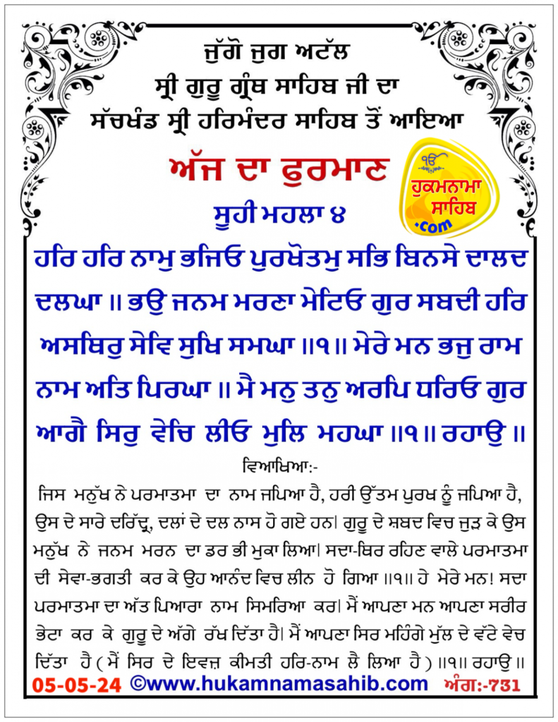 AMRIT VELE DA HUKAMNAMA SRI DARBAR SAHIB SRI AMRITSAR, ANG 731, 05-05-24