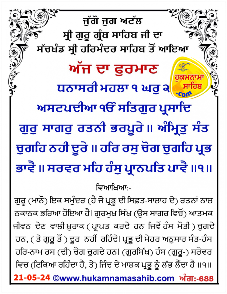 Amrit Wele da Mukhwak Sachkhand Shri Harmandar Sahib Amritsar, Ang-685, 21-05-2024