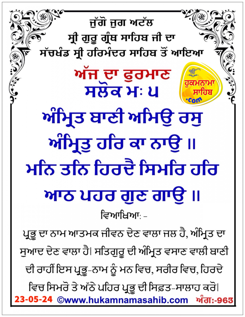 Amrit vele da Hukamnama Sri Darbar Sahib, Sri Amritsar, Ang 963, 23-05-2024