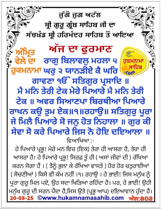 AMRIT VELE DA HUKAMNAMA SRI DARBAR SAHIB, SRI AMRITSAR, ANG 802, 20-08-2025