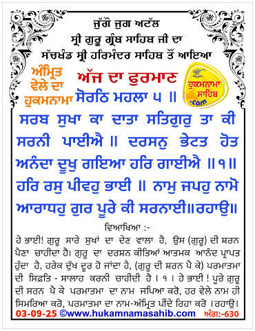 Amrit vele da Hukamnama Sri Darbar Sahib, Sri Amritsar, Ang 630, 03-09-2025