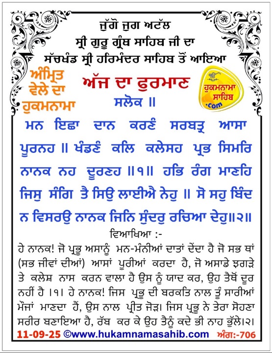 Sachkhand Sri Harmandir Sahib Amritsar Vekhe Hoea Amrit Wele Da Mukhwak, Ang 706 : 11-09-2025