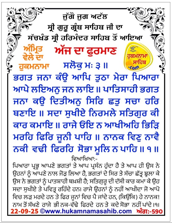 AMRITVELE DA HUKAMNAMA SRI DARBAR SAHIB, SRI AMRITSAR, ANG 590, 22-Sep-2025