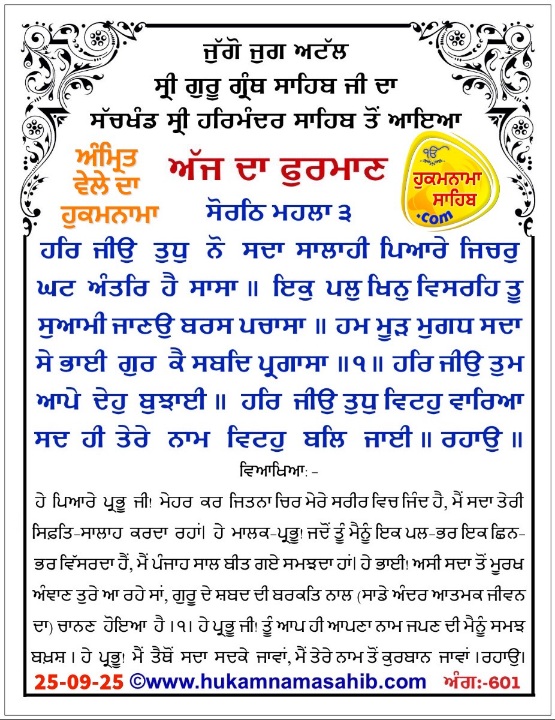 Amrit vele da Hukamnama Sri Darbar Sahib, Sri Amritsar, Ang 601, 25-09-2025