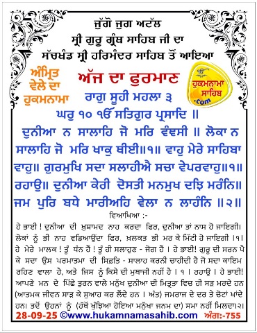 Amrit vele da Hukamnama Sri Darbar Sahib, Amritsar, Ang 755, 28-09-25