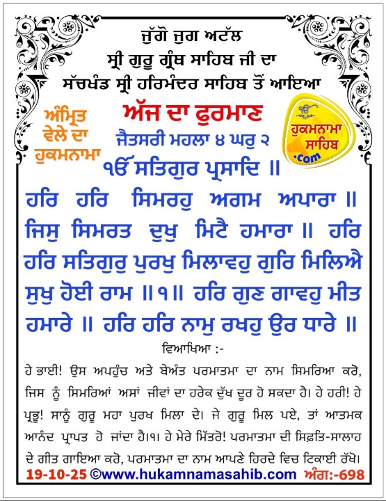 Amrit Vele Da Hukamnama Sri Darbar Sahib, Amritsar 19-10-2025 Ang 698