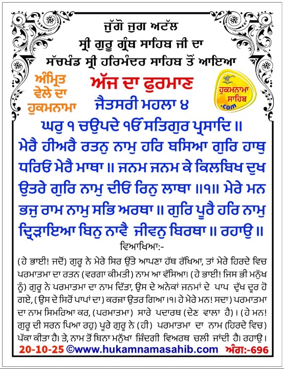 Amrit Wele Da Mukhwak Sachkhand Sri Harmandir Sahib Amritsar, Ang 696, Date : 20-10-2025