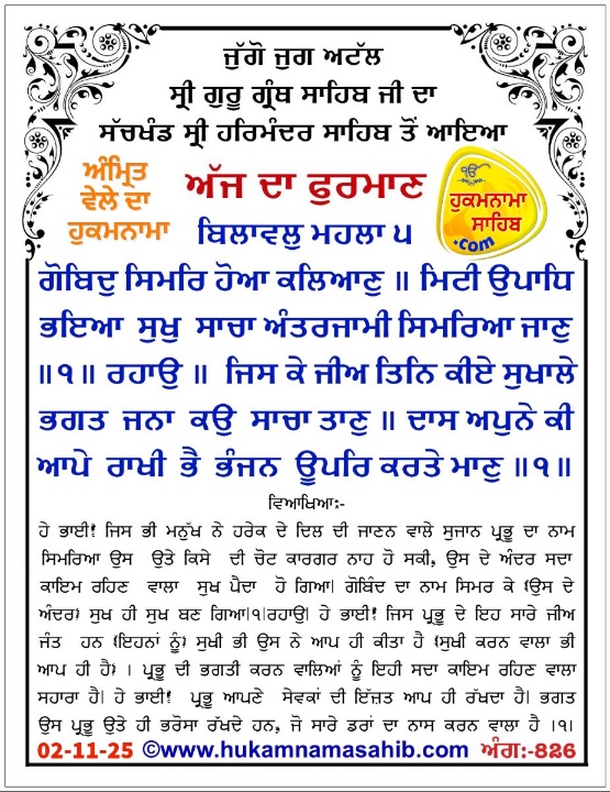 Amrit vele da Hukamnama Sri Darbar Sahib, Amritsar Sahib, Ang 826, 02-11-2025