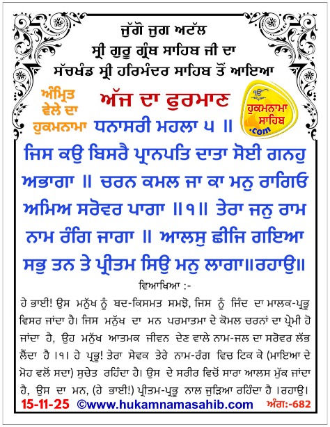 AMRIT VELE DA HUKAMNAMA SRI DARBAR SAHIB AMRITSAR, ANG 682, 15-11-2025