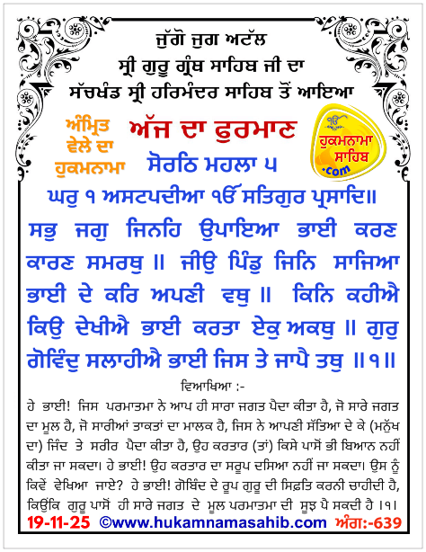 Amrit Vele da Hukamnama Sri Darbar Sahib, Amritsar, Ang 639, 19-11-2025