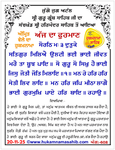 Amrit vele da Hukamnama Sri Darbar Sahib, Amritsar, Ang 602, 20-11-25