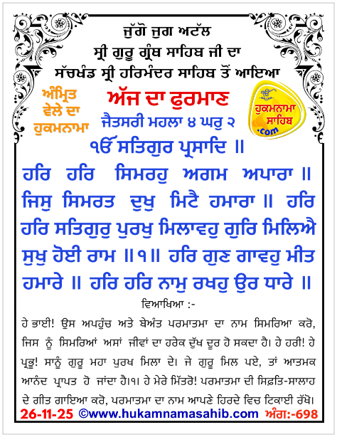 Amrit Vele Da Hukamnama Sri Darbar Sahib, Amritsar, 26-11-2025 Ang 698