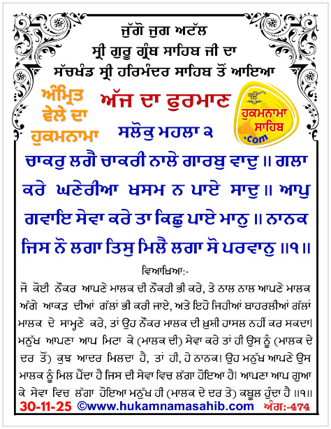 Amrit vele da Hukamnama, Sri Darbar Sahib, Amritsar, Date 30-11-2025 Ang 474