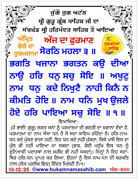 AMRIT VELE DA HUKUM NAMA SRI DARBAR SAHIB AMRITSAR, ANG 600, 13-12-2025