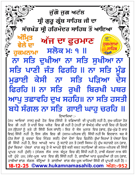 Amrit Vele da Hukamnama Sri Darbar Sahib, Amritsar, Ang 952, 18-12-2025
