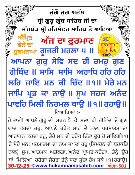 Amrit vele Da Hukamnama Sri Darbar Sahib, Sri Amritsar, Ang-501, 30-12-2025