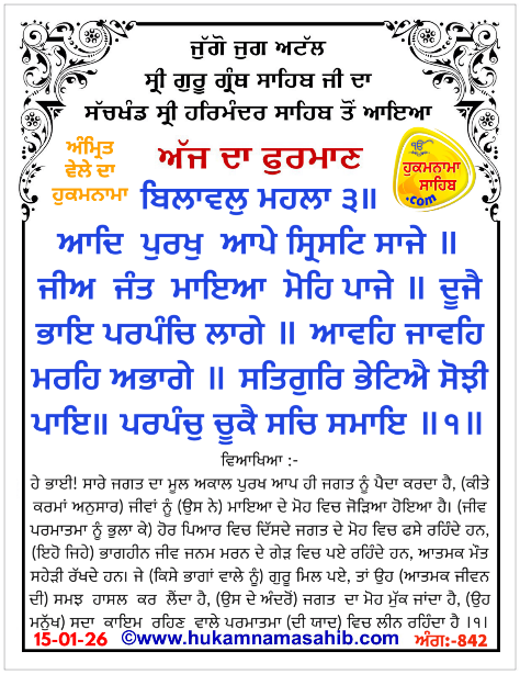 Amrit vele da Hukamnama Sri Darbar Sahib, Sri Amritsar, Ang 842, 15-01-2026