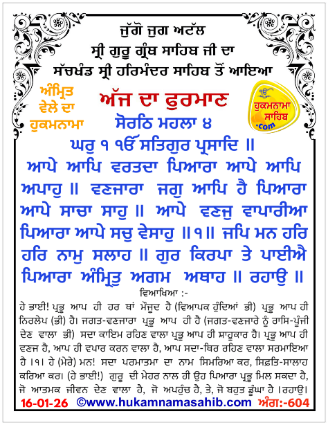 AMRIT VELE DA HUKAMNAMA SRI DARBAR SAHIB AMRITSAR, ANG 604, 16-01-26