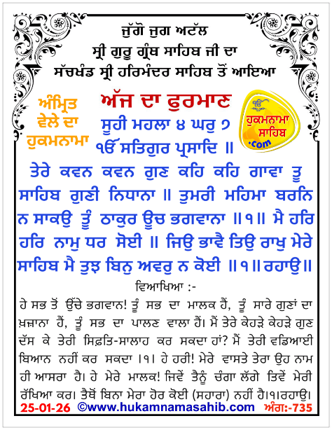 Amrit Vele da Hukamnama Sri Darbar Sahib, Amritsar Sahib Ang 735, 25-01-2026