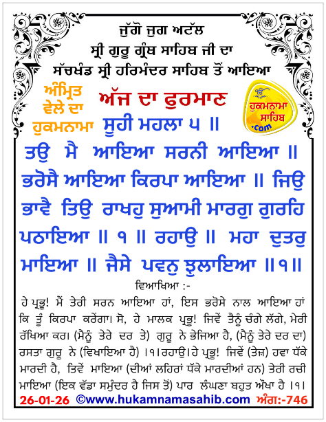 Amrit vele da Hukamnama Sri Darbar Sahib, Sri Amritsar, (ANG 746), 26-01-2026