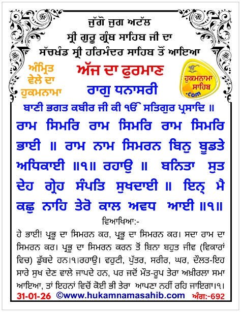 Amrit Wele Da Mukhwak Sachkhand Sri Harmandir Sahib Amritsar, Ang 692, 31-01-26