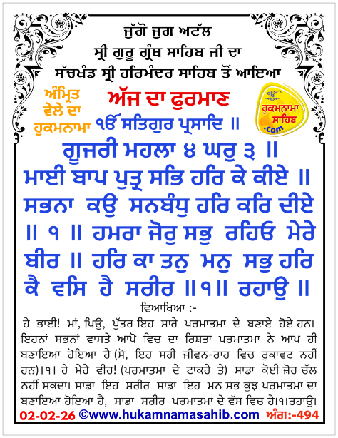 AMRIT VELE DA HUKAMNAMA SRI DARBAR SAHIB, SRI AMRITSAR, ANG 494, 02-02-26