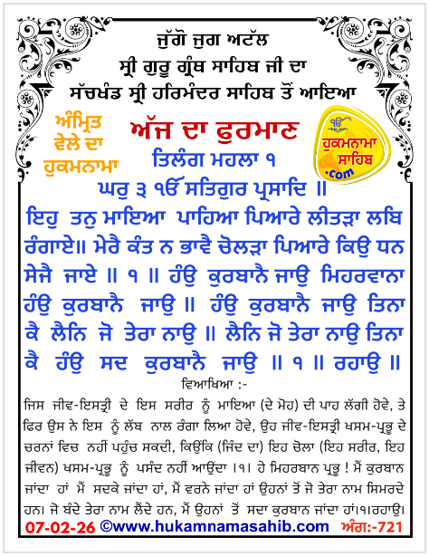 Amrit Vele da Hukamnama Sachkhand Sri Darbar Sahib Amritsar, Ang 721, Date:07-02-26